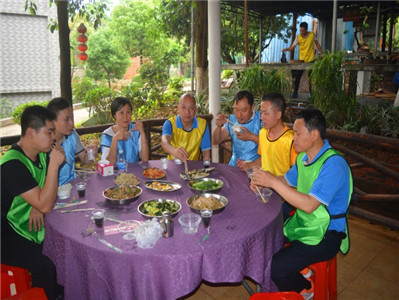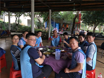 随后我们开启了“美食制作、美食享用”环节,各位厨神们大展身手、帮厨们密切配合,通力合作,经过约40分钟的精心制作,每桌八菜一汤的美味佳肴呈现在我们的餐桌上,亲手制作的可口饭菜,温馨的气氛,大家边吃边聊,交流工作和生活的点点滴滴,欢乐的情绪逐渐弥漫……